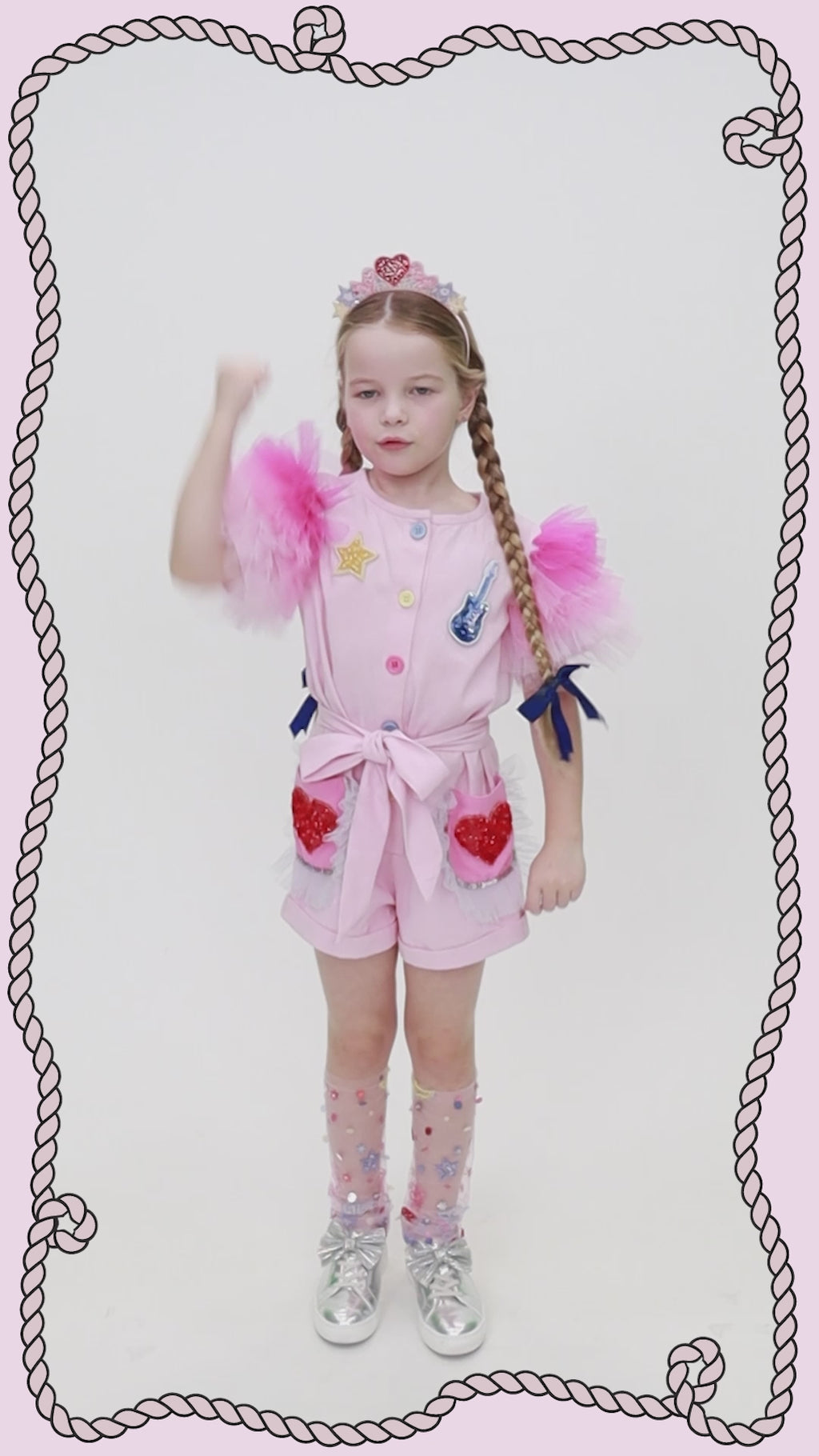 Bright, bold, and ready to boogie! The Rock 'n' Roll Onesie in a sweet Candy Floss Mix is made for little ones who love to dance, sing, and play all day. Crafted from soft cotton drill, this playful piece is all about comfort with a colourful twist. The ombre layered tulle frill sleeves add a burst of rainbow magic, perfect for twirling and grooving to favourite tunes. With two handy pockets trimmed in tulle frills and topped with sparkling heart embellishments, there’s room for treasures and treats on the go. Colourful buttons, along with a star and guitar detail on the front, strike just the right note of fun and flair, finished off with a cinched waist and a soft belt.