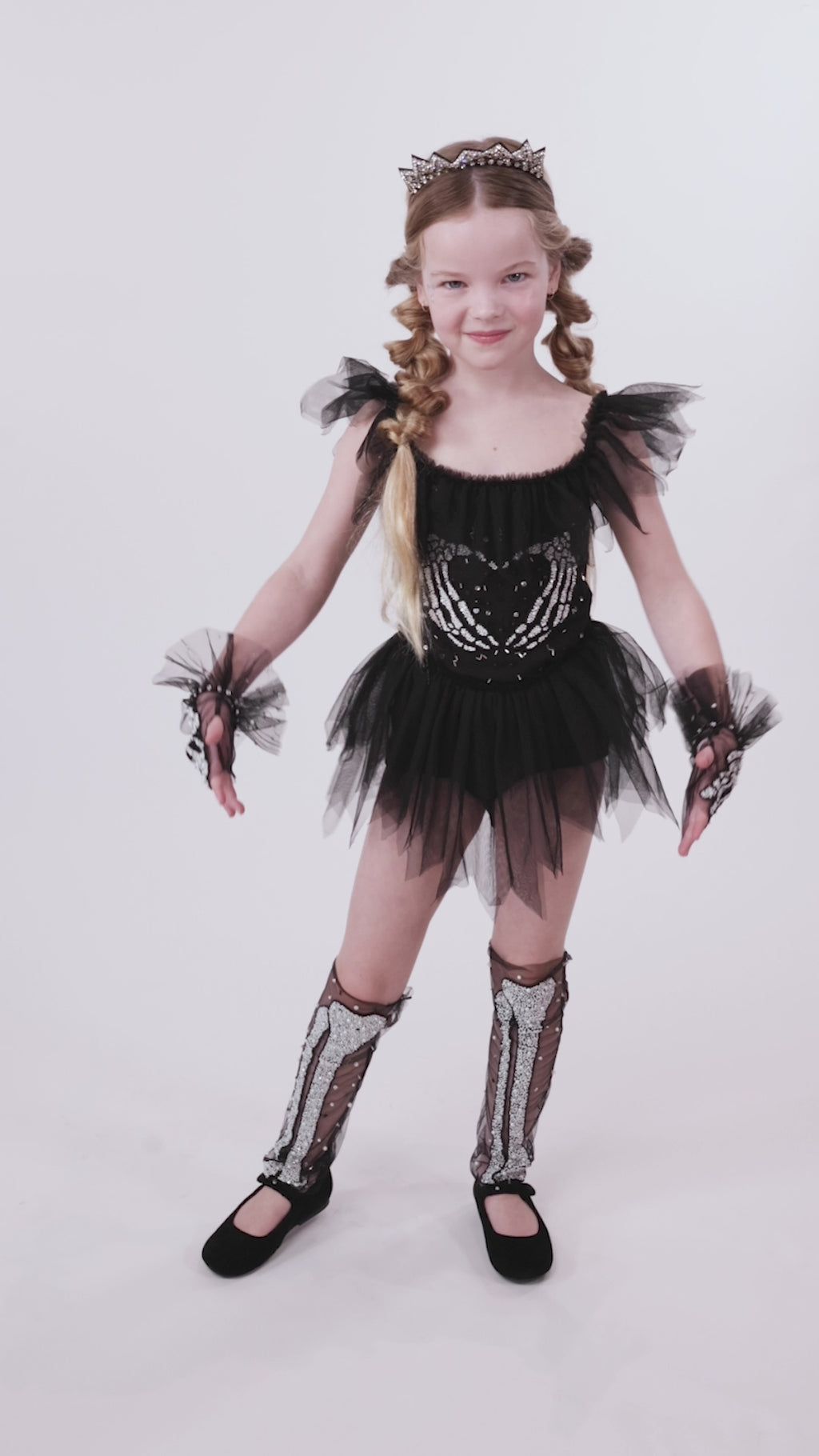 Finish her look with the Bone Appetit Gloves in Black. These gloves feature elasticated cuffs with gathered frills and a thumbhole to ensure an extra snug fit. The embellished skeleton fingers add just the right amount of spooky flair, pair with our I heart you to the Bone Onesie, leggings and cape for the ultimate Halloween outfit.