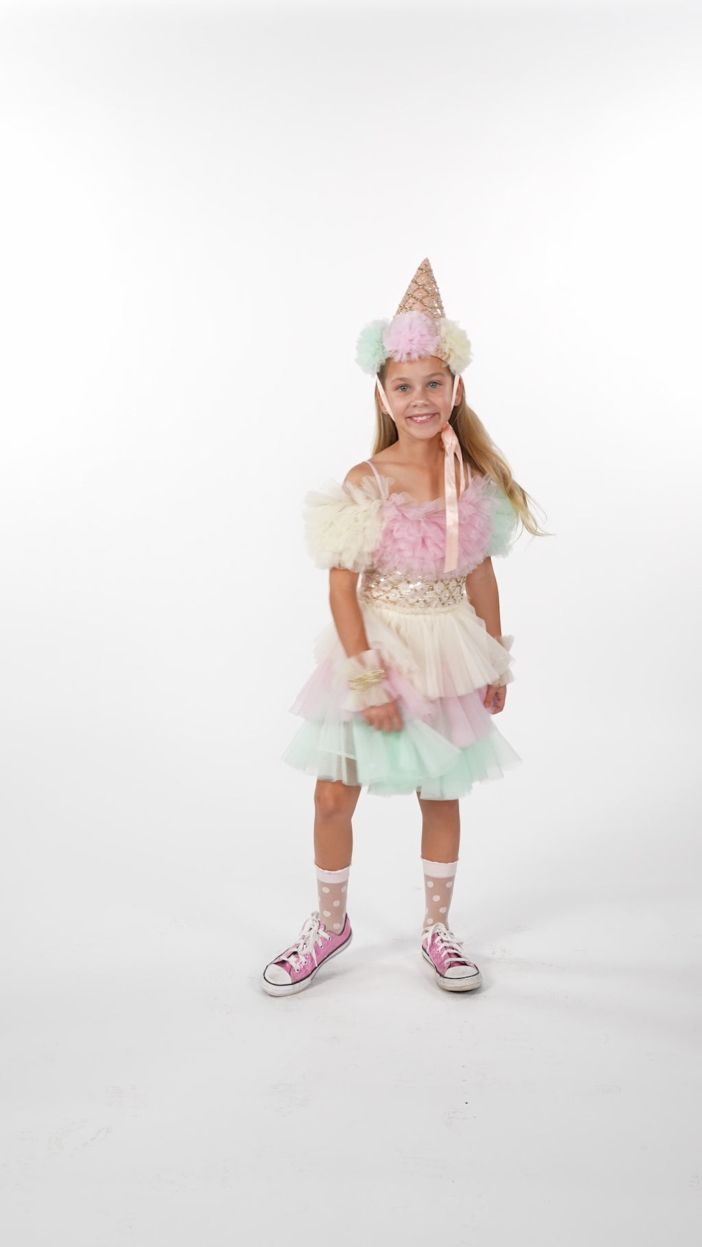 These playful cuffs feature a sparkling mix of sequins and beads scattered like sprinkles across layers of soft tulle ruffles in Strawberry Pink, Mint Green, and Vanilla Cream. Set on elasticated bands for a comfy, secure fit, they're the perfect finishing touch to any ice cream-inspired look.