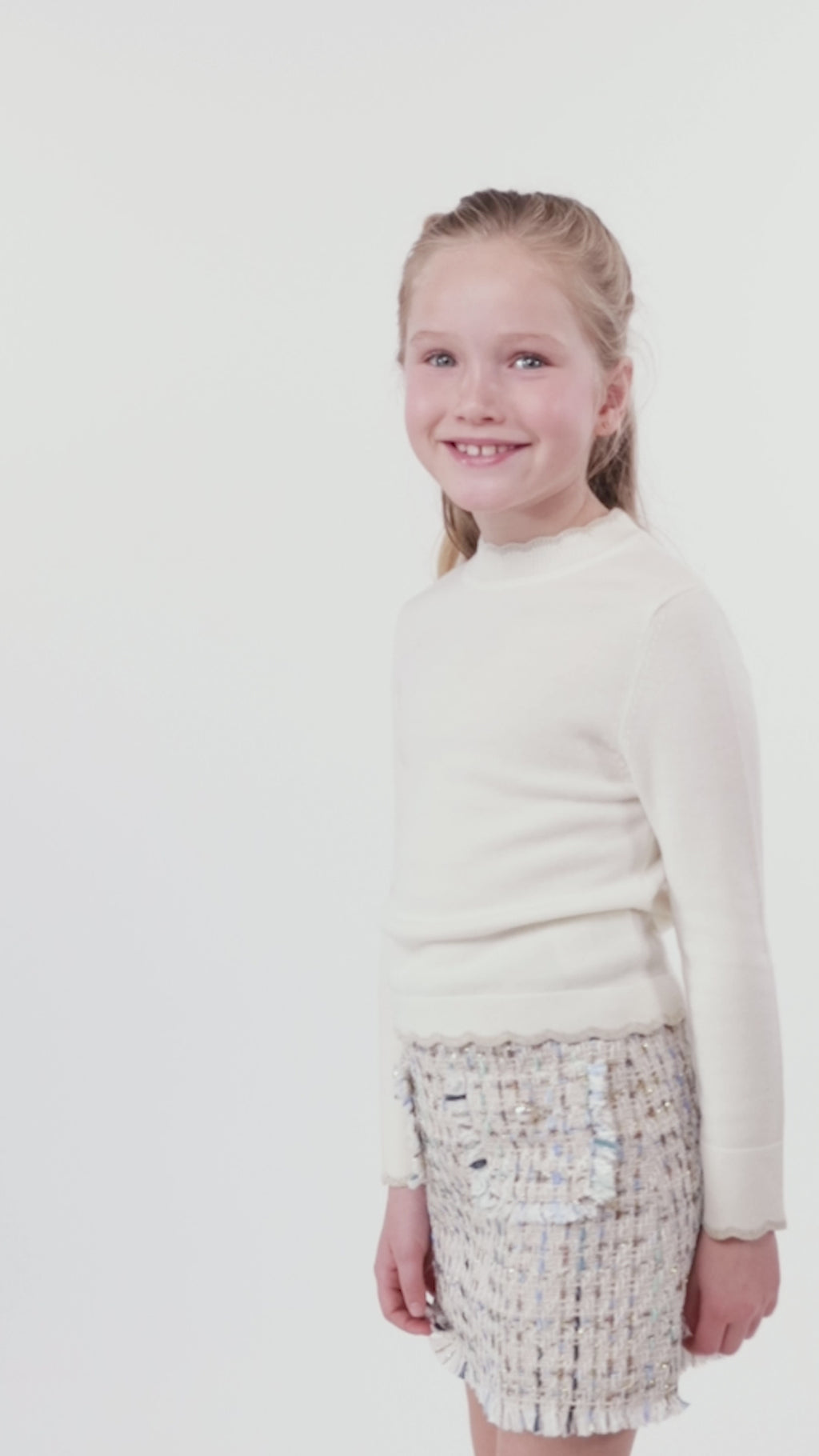 The Skyway top in Ecru is a winter wardrobe staple. The classic top features a scalloped edge with a touch or lurex for extra sparkle, combining style and comfort for your little one.