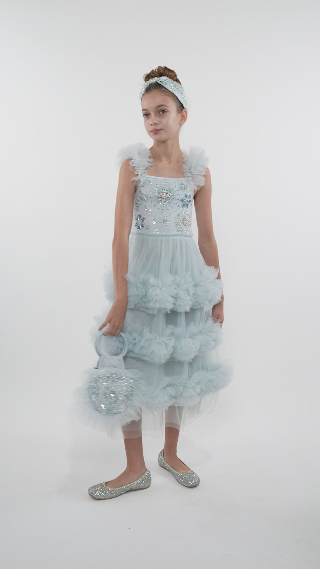 A celebration of light, movement, and magic, the Soraya Tutu Dress in Illusion Blue is made to mesmerize. Its flowing triple ruffle hem creates a dramatic, graceful silhouette that floats with every step, while the delicate ruffled sleeves add a romantic touch. The bodice is a true showpiece - a dazzling firework of sequins and beads, sparkling like starlight on a clear night. Perfect for special moments and festive occasions, the Soraya Dress is made for those who love to shine.