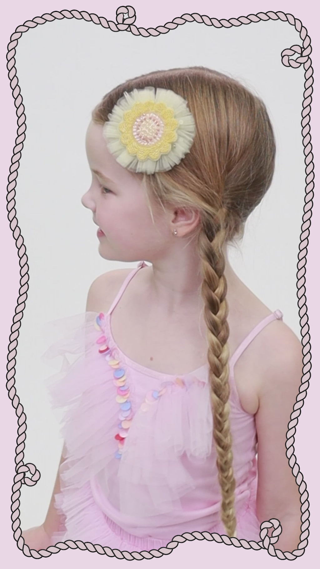 Brighten up her day with the Sunflower Power Hairclip in Daisy, a whimsical accessory that’s all about fun and flair! This enchanting clip features a playful sunflower face nestled in the centre, surrounded by a soft halo of fluffy tulle. Securely mounted on a clip for a charming and secure addition to any hairstyle, she’ll be ready to spread smiles and sparkle wherever she goes!