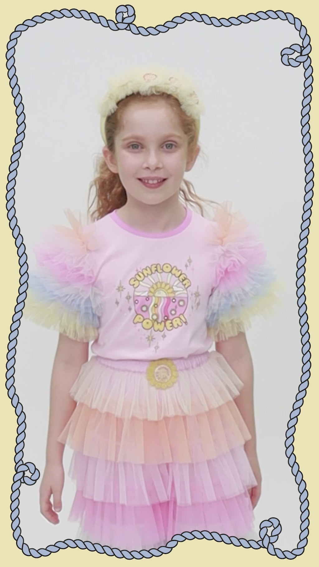 Shine bright and bloom bold in the Sunflower Power T-shirt in Candy Floss Mix! Made from soft cotton jersey, this tee features dreamy ombré tulle ruffle sleeves that add a statement touch. The front showcases a radiant sunflower power graphic set against a glowing sunset, perfect for spreading sunshine and good vibes wherever she goes.