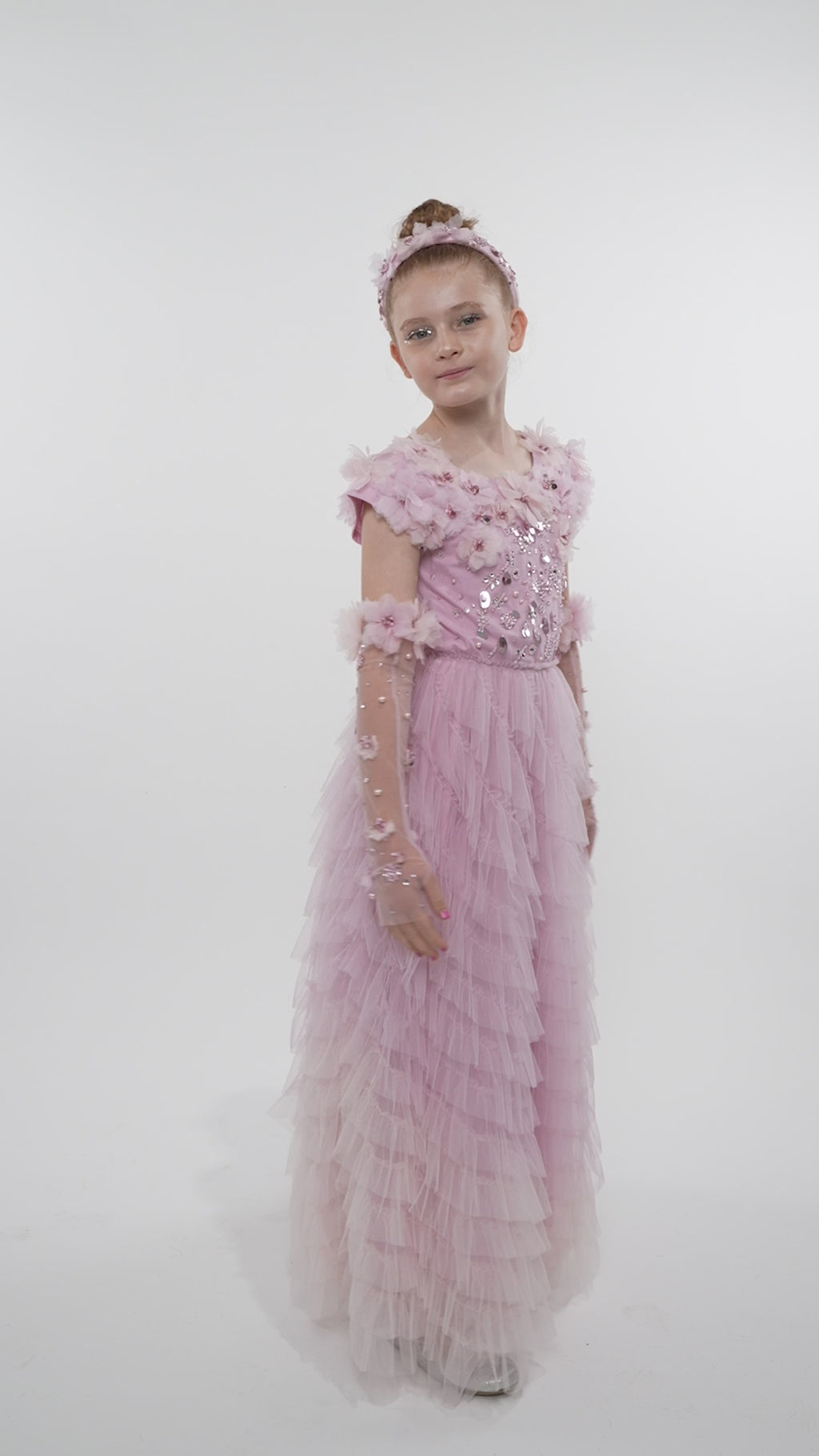 The Zahra Tutu Dress in Fairy Floss is like stepping into a world of sweetness, sparkle, and sunshine, designed to make every moment feel like a celebration. With its full, layered ombré effect skirt that flows beautifully from soft peach to blush pink, this dress is a showstopper from every angle. Organza flowers dance along the cap sleeves and neckline, adding a whimsical charm. The bodice dazzles with intricate embellishments of sequins, gems, and pearls that shimmer like a burst of confetti, catching the light with every twirl.